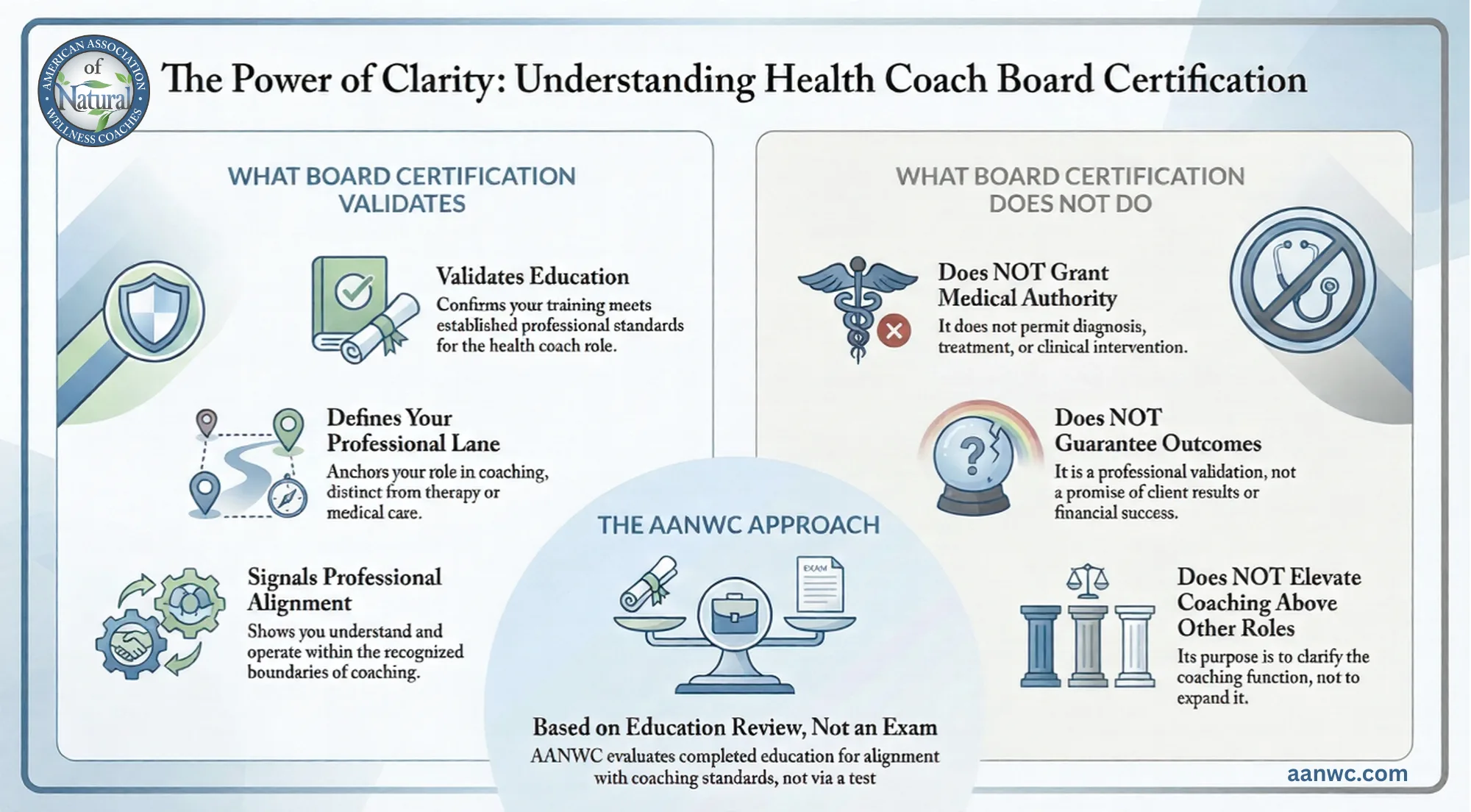 AANWC Health Coach Board Certification is a professional credential that validates a coach’s education and role within the health coaching field. It confirms that training has been reviewed against established standards while reinforcing clear coaching boundaries. Board certification supports professional clarity without granting medical authority or guaranteeing outcomes.